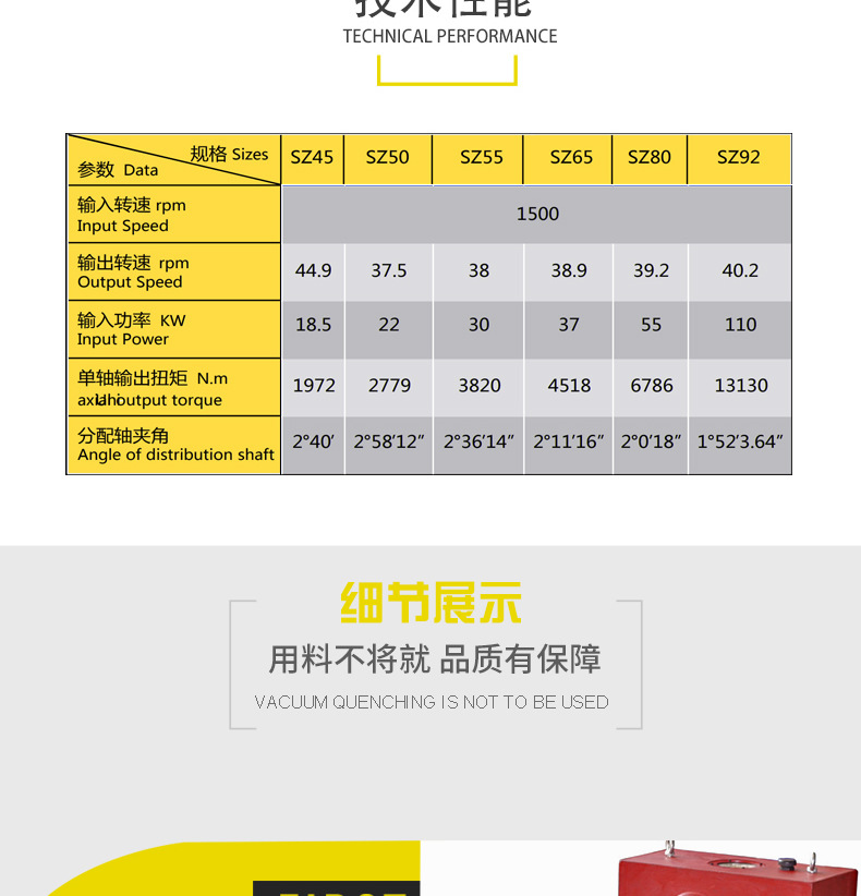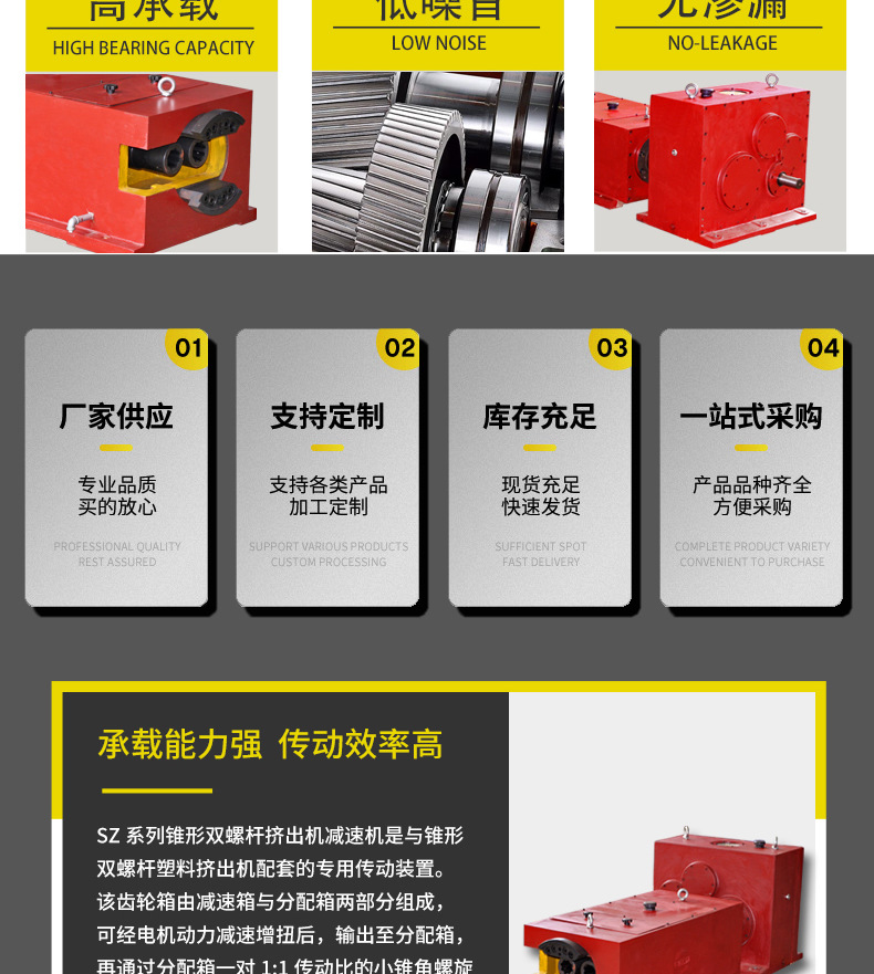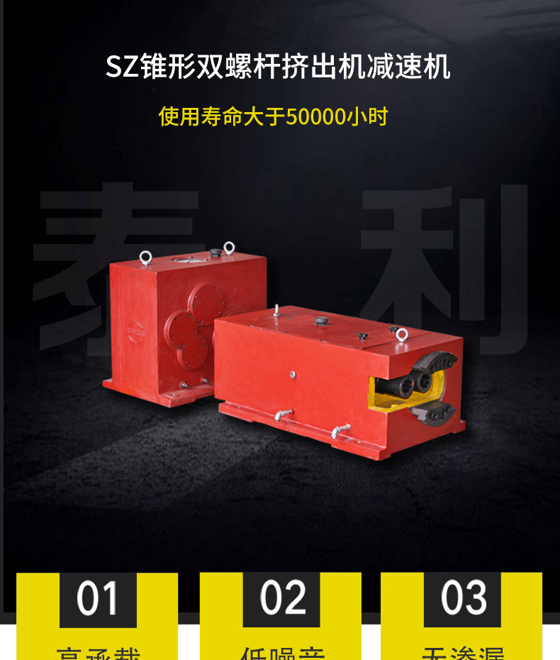 The transmission ratio of SZ conical twin-screw reducer is 38, with a maximum power of 110000 watts, suitable for the transmission needs of various extruders. Its material is cast iron, which has high durability and stability